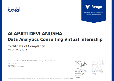 I completed practical tasks encompassing data quality assessment, deriving insights, and presenting findings. The virtual internship provided valuable exposure to the data analytics consulting domain. Working on real-world scenarios helped me apply classroom learnings to practical situations. Overall, it was an enriching experience that inspired me towards a career in data analytics consulting.