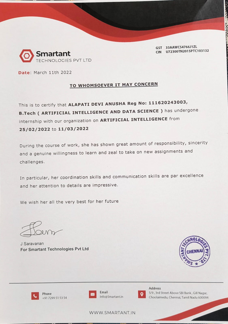 As an AI/Data Science intern, I gained hands-on exposure at Smartant Technologies over 2 weeks. Challenging assignments honed my technical skills and eagerness to learn under guidance. The nurturing environment boosted my confidence for taking on future professional roles.